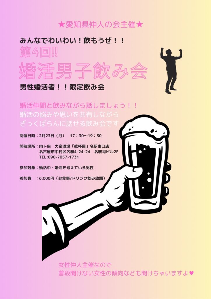 | イベント名 | 男性限定★婚活飲み会🍻 こんな方にオススメです! ⬜婚活仲間と話してみたい ⬜同じ悩みを持つ仲間と気持ちを共有したい ⬜デートの内容や女性への対応などこんな時他の人はどうしてるか知りたい ⬜とにかく明るい気持ちになりたい!! 結婚したい!思いを抱く頑張る婚活男性のための飲み会です。 普段触れ合う機会の少ない同性の婚活仲間とざっくばらんに話しましょう。 婚活中の男性であればどなたでもご参加頂けます。 名古屋駅直近の居酒屋での開催です。半個室なのでまわりを気にせず悩みをシェアできます💕 |